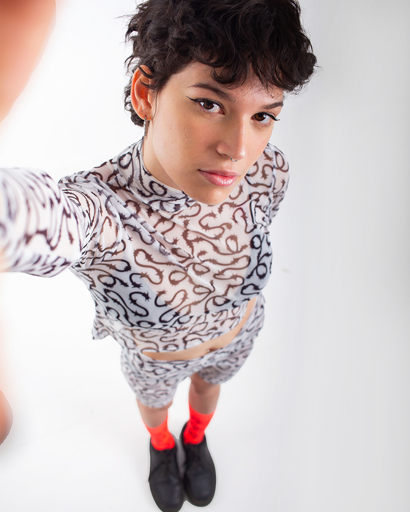 Este cropped é mais do que uma peça de roupa; é uma declaração de criatividade, uma celebração da independência artística e uma manifestação do desejo de explorar novos territórios visuais em defesa da moda como meio de comunicação. Vista-se com a essência do FRENESI e faça parte desta celebração da euforia, da noite e da comunidade.