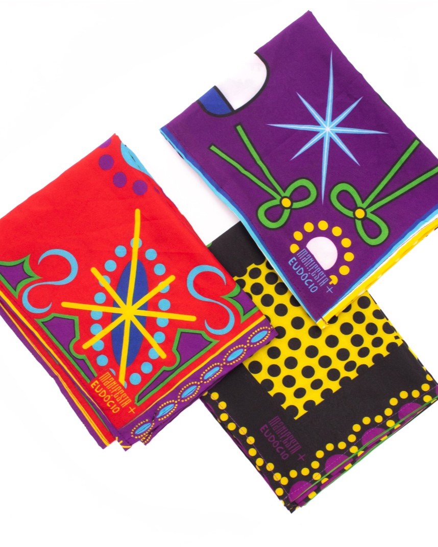 Este lenço faz parte da Edição Especial Eudócio da Manifesta, uma homenagem ao renomado artista popular Manuel Eudócio e a seu filho Ademilson Eudócio, que continuam a tradição da arte do barro em Caruaru, Pernambuco. Manuel Eudócio, nascido em 1931, foi um dos maiores expoentes da arte popular brasileira, conhecido por suas esculturas que retratam a rica cultura nordestina.